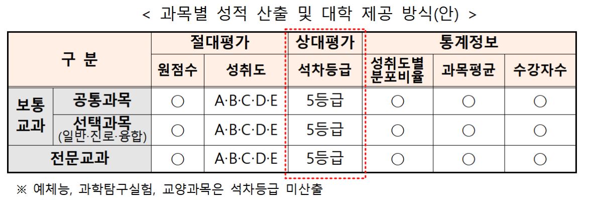 내신 교과는 상대평가 과목을 기준으로 석차등급(1~5등급)을 비롯해 ▲원점수 ▲성취도(A~E 5단계) ▲성취도별 분포비율 ▲과목평균 ▲수강자수를 산출하고 대학에 제출해 입시 전형 자료로 쓸 수 있도록 한다.
