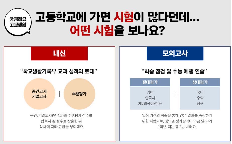내신평가는 중간/기말고사 지필고사를 일 년에 4번을 치른다, 예전과 동일하다.