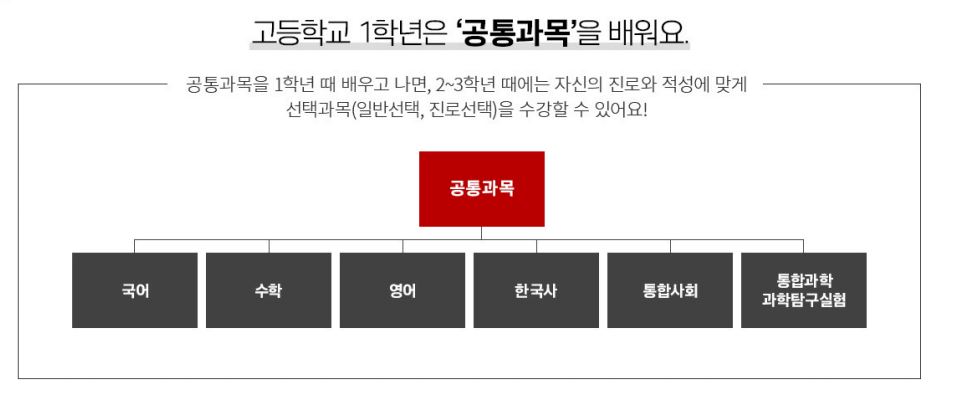 과목에는 공통과목과 선택과목이 있는데 고등학교 1학년때는 공통과목을 배운다고 보면 된다.