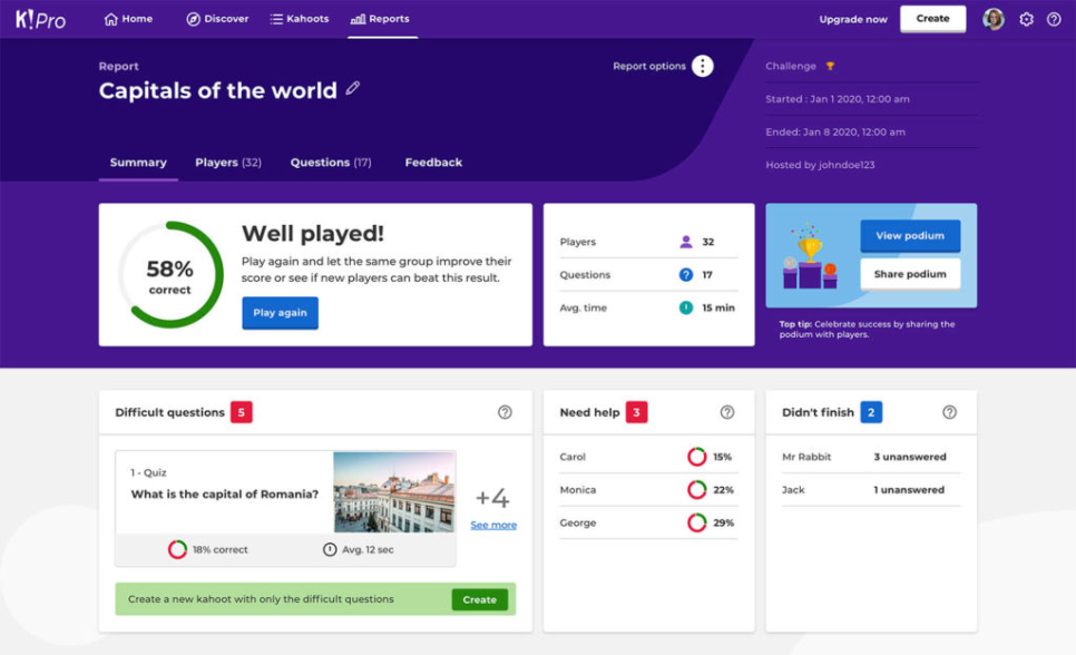 - 다양한 유형의 퀴즈 제작 가능- 학생들에게 간단한 피드백 제공- 실시간 피드백 및 분석 기능- 실시간 점수판: 학생들이 퀴즈를 풀면서 자신의 점수를 실시간으로 확인- 성과 분석: 퀴즈 종료 후 교사가 학생들의 답변 결과를 분석- 내보내기: 분석 데이터를 파일로 내보내 깊이 있는 분석이나 학부모 상담에 활용- 각 질문에 대한 답변 시간 설정 가능- 다양한 학습 방식 지원: - 개별 학습: 학생들이 개별적으로 퀴즈를 풀며 자신의 학습 속도에 맞춤 - 팀 기반 학습: 학생들을 팀으로 나누어 협력 학습을 장려하고 상호작용 증대 - 과제 기능: Kahoot에서 생성한 퀴즈를 과제로 설정, 학생들이 자율적으로 학습 지원
