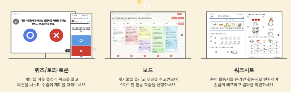 | 특별 기능 | 게임 형식, 실시간 랭킹 | 토의토론 기능, 보드 기능 | 실시간 피드백, 우주선 경주 게임 |