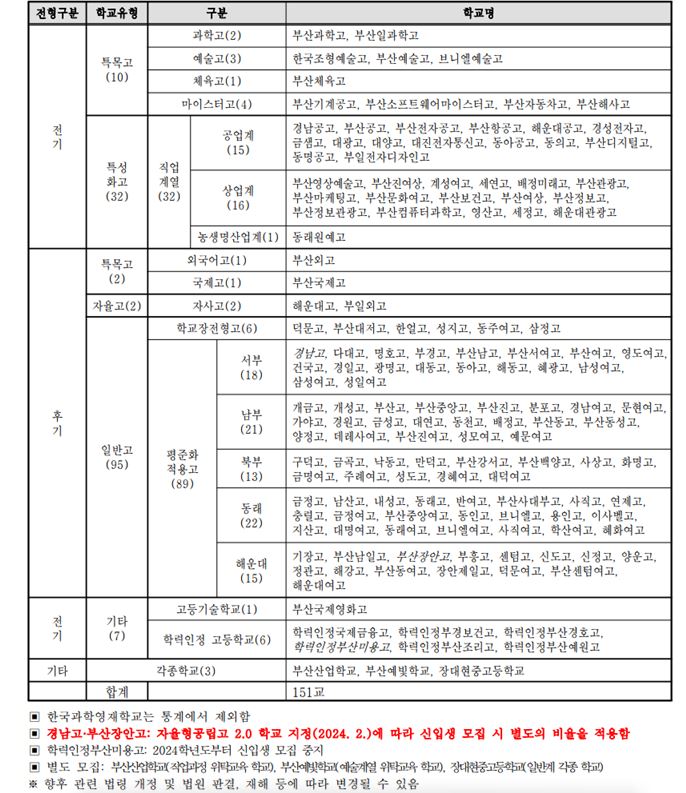 부산에는 전기고, 후기고 포함 총 151개의 고등학교가 있다.