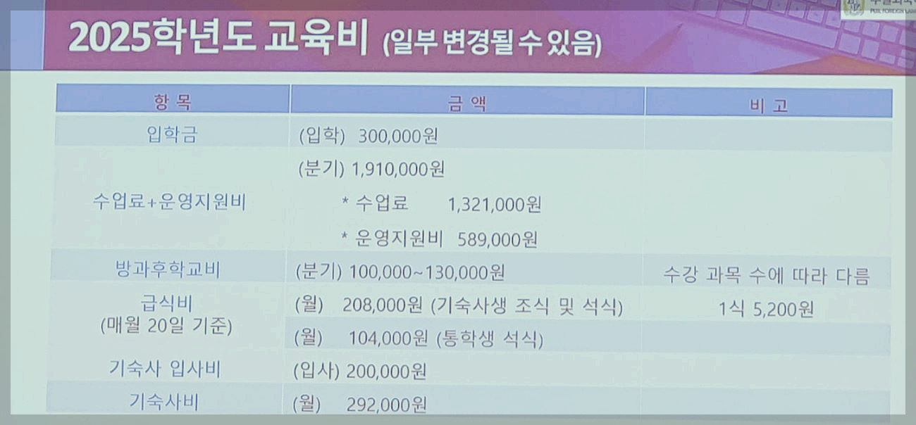 기숙사 입회여부에 따라 비용은 또 달라질 것 같다.