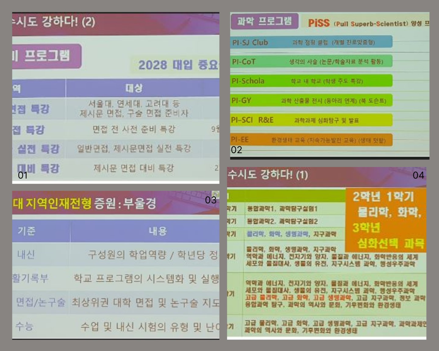 | 1.다양한 교육과정 2.면접대비 프로그램 3.학생 개별 맞춤 진학지도 4.다양한 과학 프로그램 |
