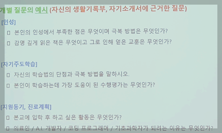 | 개별 문항 질문 내용은? | 자기소개서+생활기록부 관련 질문 |