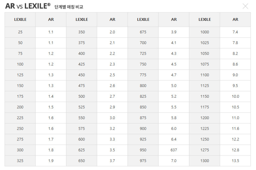 4. AR지수와 렉사일지수 변환표(단순 참고용)