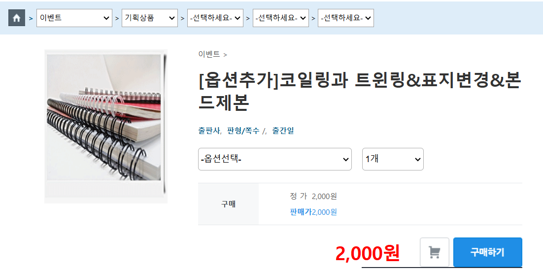 스프링 제본 추가 옵션 페이지가 별도로 있음 (1개당 2천 원)