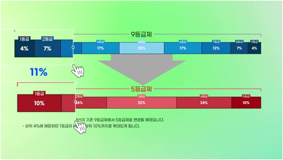 * 5등급제: 기존 9등급제에서5등급 제로 변경되어, 1등급 비율이 4%에서 10%로 변경됨