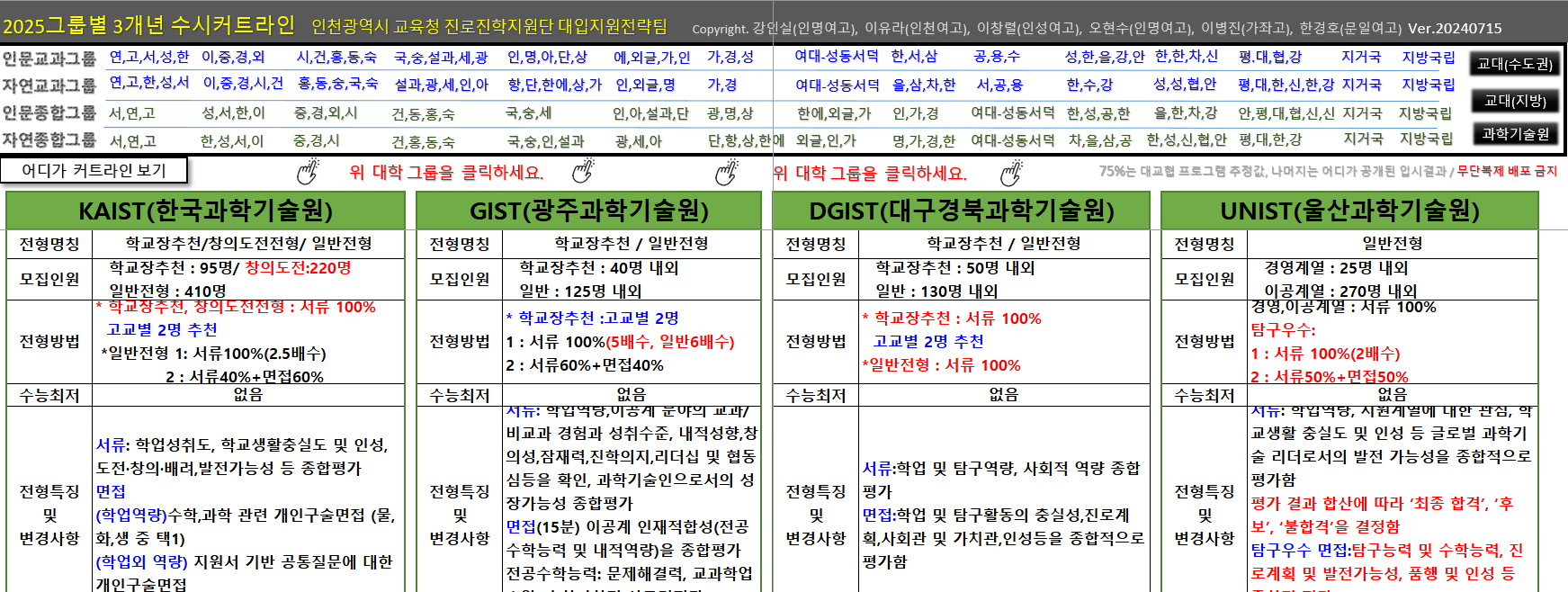 엑셀파일 끝부분으로 가보면 지역거점국립대학 (지거국) 과 수도권 교대, 지방 교대, 과기원 등
