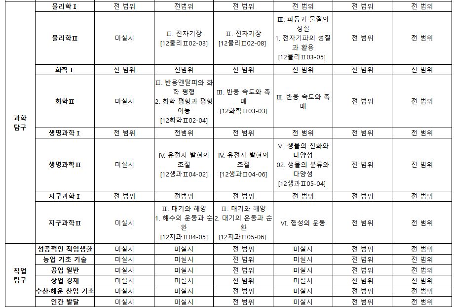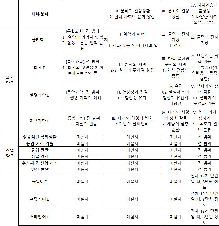 반면 내년 고1 학생들은 수능에서 선택과목 자체가 사라지기 때문에 범위표 자체가 좀 심플해진 것을 알 수 있다.