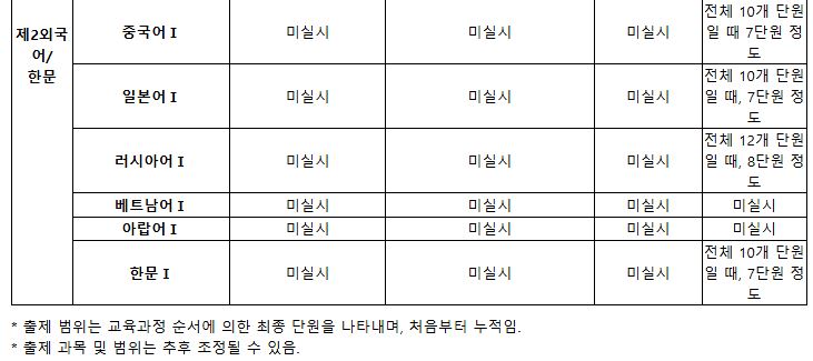 내년 고2. 고3학생들은 아직 선택과목이 많기 때문에 시험범위표 자체도 매우 복잡하다.
