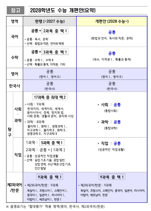 | 구 분 | 기 존 (현 재) | 변경(2028년 수능시험~) |