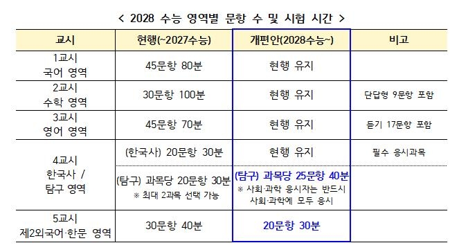 - 제2외국어·한문영역은 기존 30문항, 40분에서 2028학년도부터 20문항, 30분으로 축소