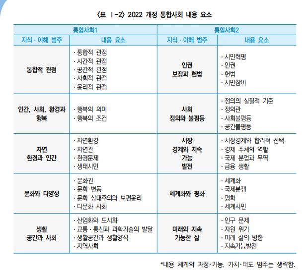 교육부는 2022 개정 통합사회 교육과정은 내용 체계와 성취기준 측면에서 2015 개정 통합사회 교육과정과 큰 차이를 보이지 않지만, 2015 개정 교육과정에서는 ‘통합적 관점’이 별도의 내용 영역으로 제시되지 않았던 것과는 달리 2022 개정에서는 첫 번째 내용 영역으로 등장하여 과목의 성격과 체계, 구성을 아우르고 있다는 점이 특징적이라고 밝혔다.