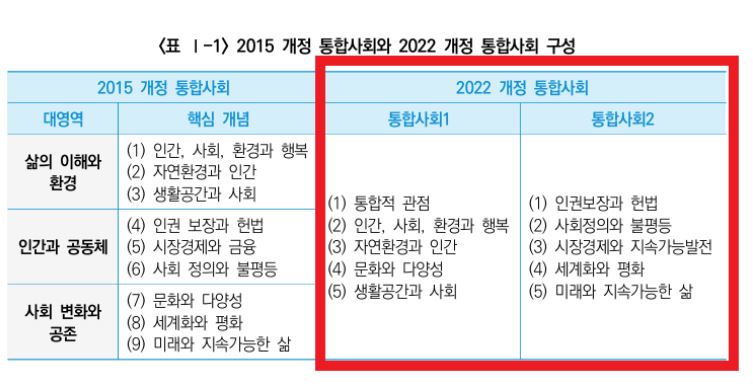 교육부는 2022 개정 통합사회 교육과정은 내용 체계와 성취기준 측면에서 2015 개정 통합사회 교육과정과 큰 차이를 보이지 않지만, 2015 개정 교육과정에서는 ‘통합적 관점’이 별도의 내용 영역으로 제시되지 않았던 것과는 달리 2022 개정에서는 첫 번째 내용 영역으로 등장하여 과목의 성격과 체계, 구성을 아우르고 있다는 점이 특징적이라고 밝혔다.